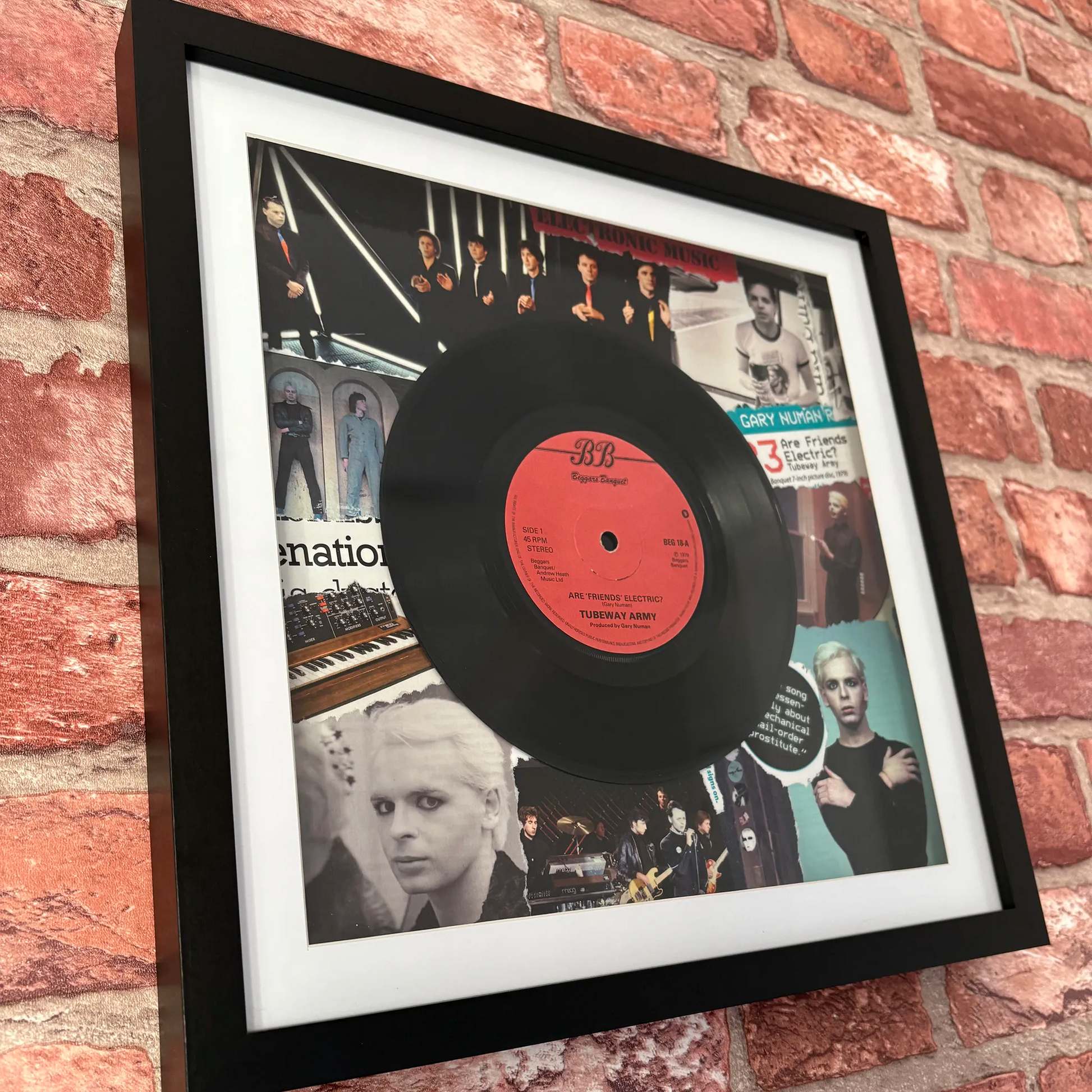 Introducing a distinctive and exclusive piece: This original and rare Tubeway Army "ARE FRIENDS ELECTRIC" vinyl single from 1979 has been artfully mounted onto a handcrafted collage made from authentic vintage music magazine cuttings – no prints, only genuine materials. The entire creation is beautifully encased in a high-quality deep wooden frame, ready to make your walls pop!