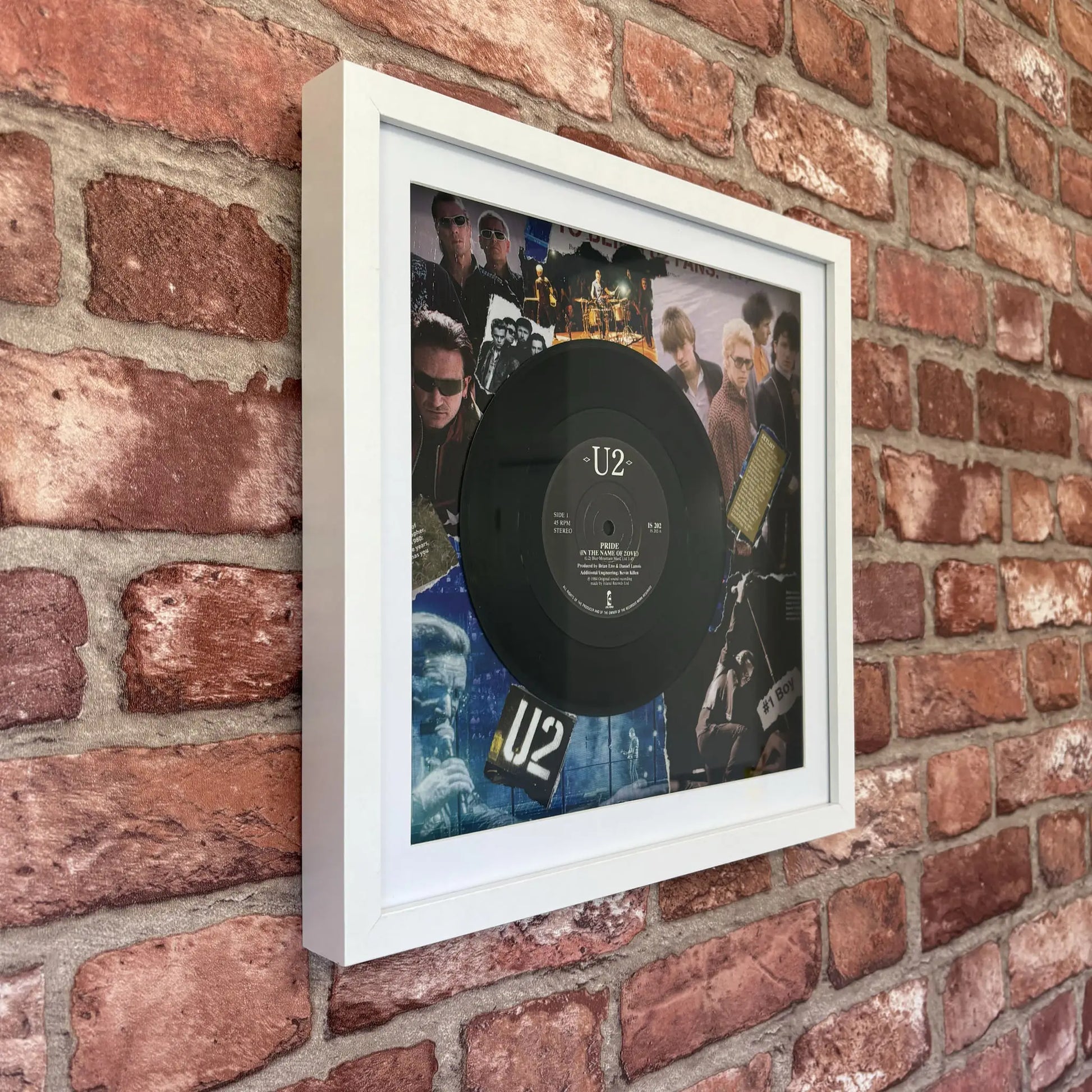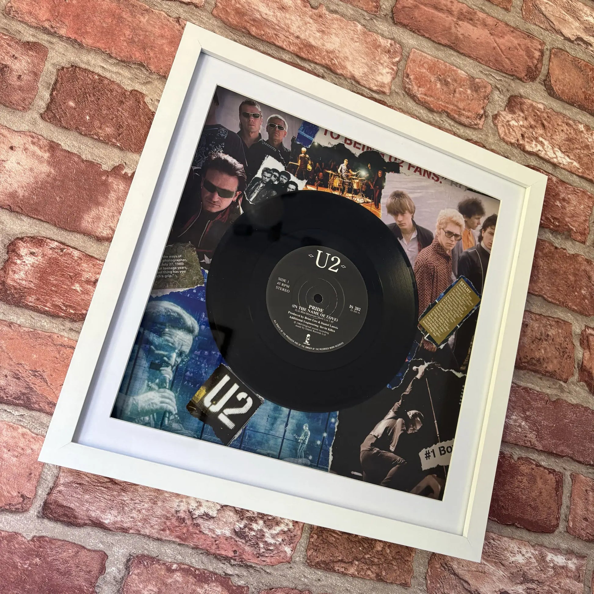 Introducing a distinctive and exclusive piece: This original and rare U2 "Pride (In The Name Of Love)" vinyl single from 1984 has been artfully mounted onto a handcrafted collage made from authentic vintage music magazine cuttings – no prints, only genuine materials. The entire creation is beautifully encased in a high-quality deep wooden frame, ready to make your walls pop!